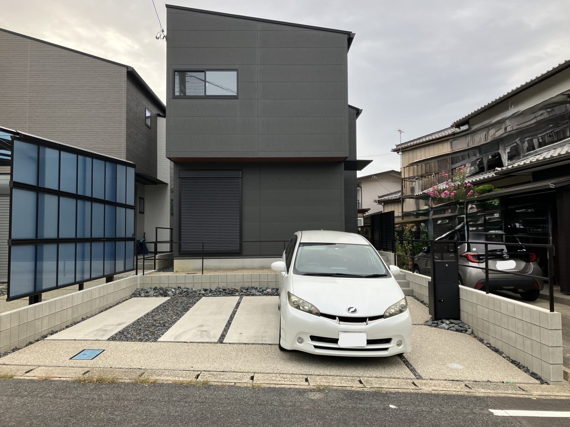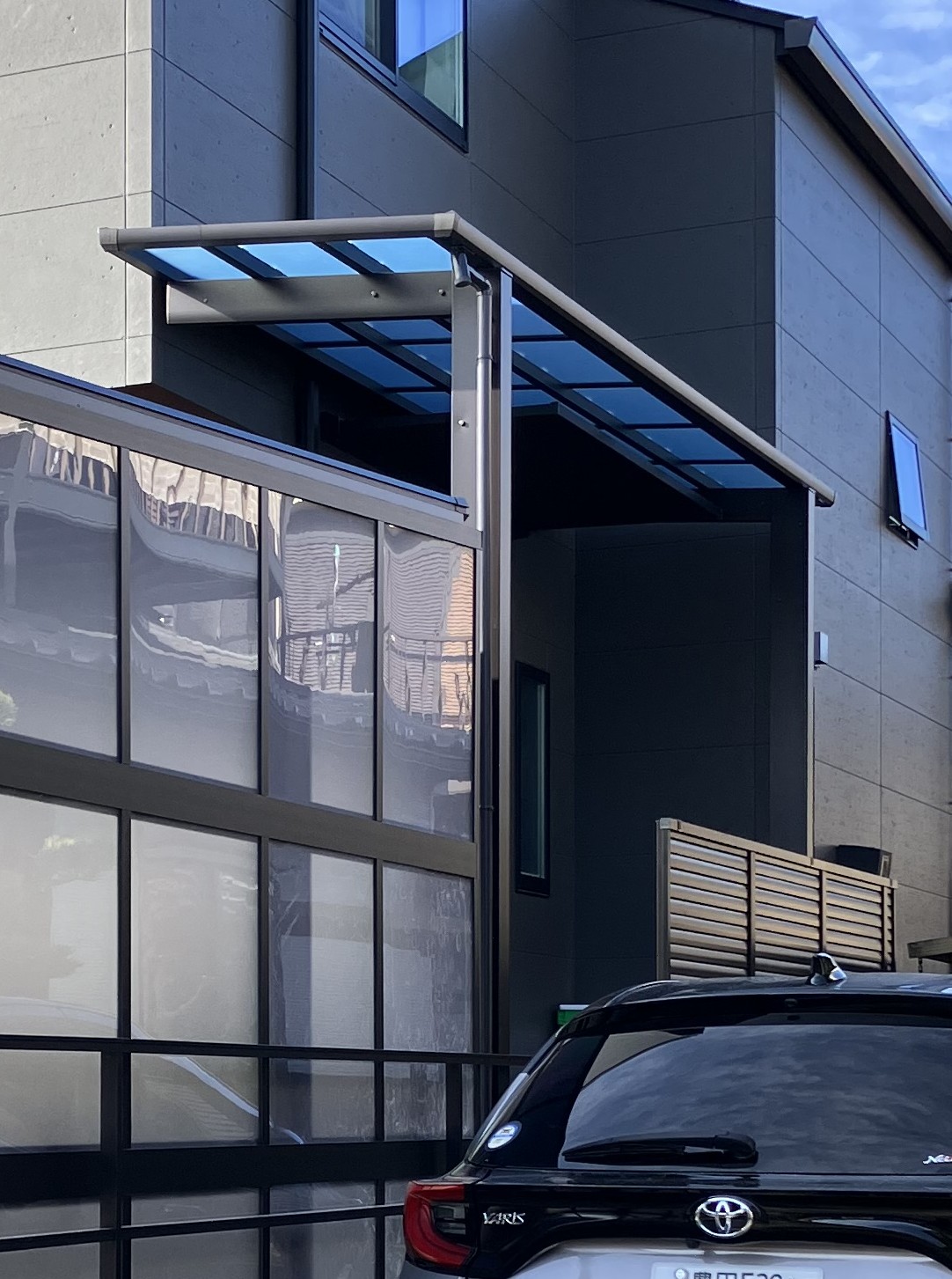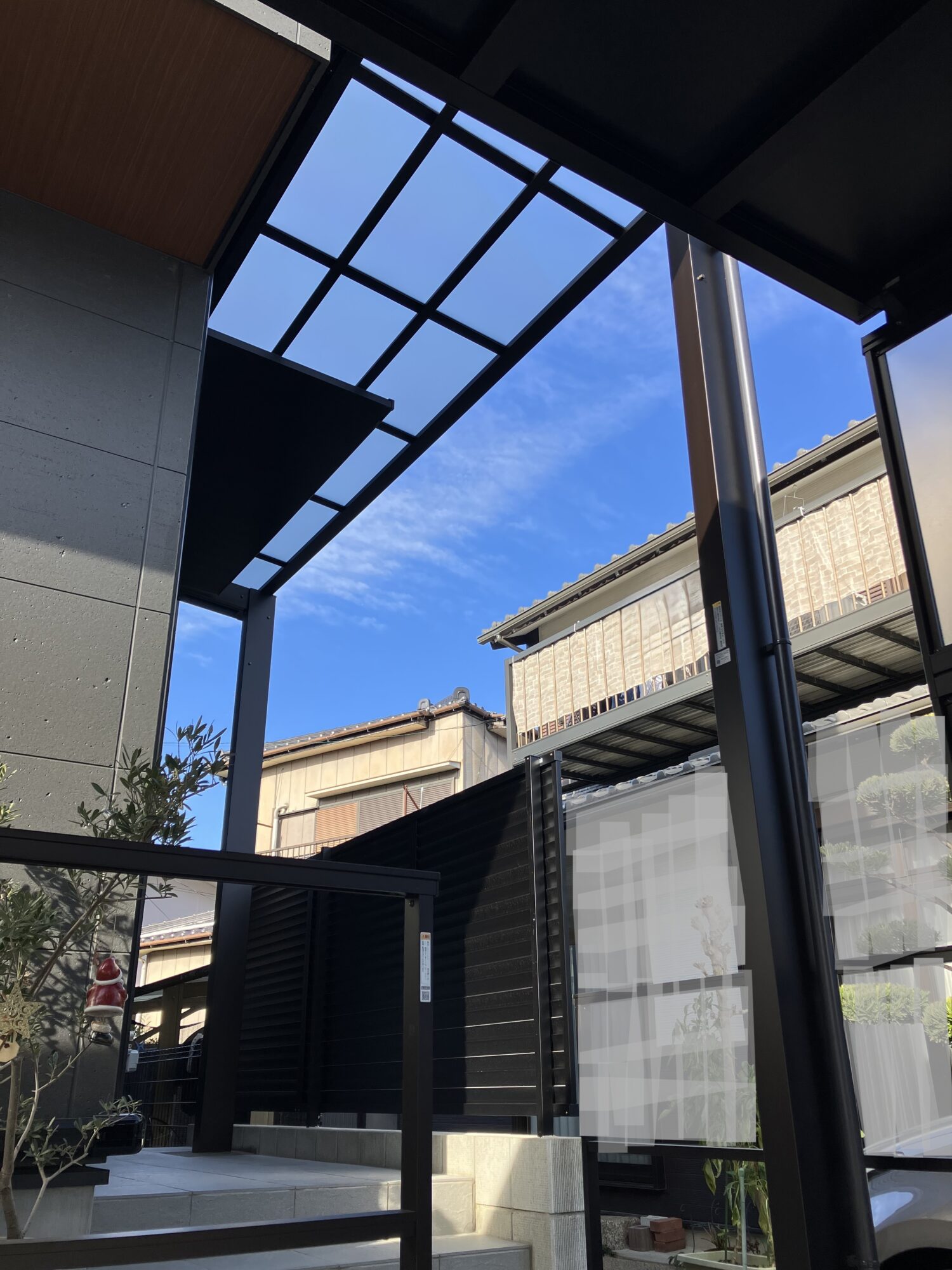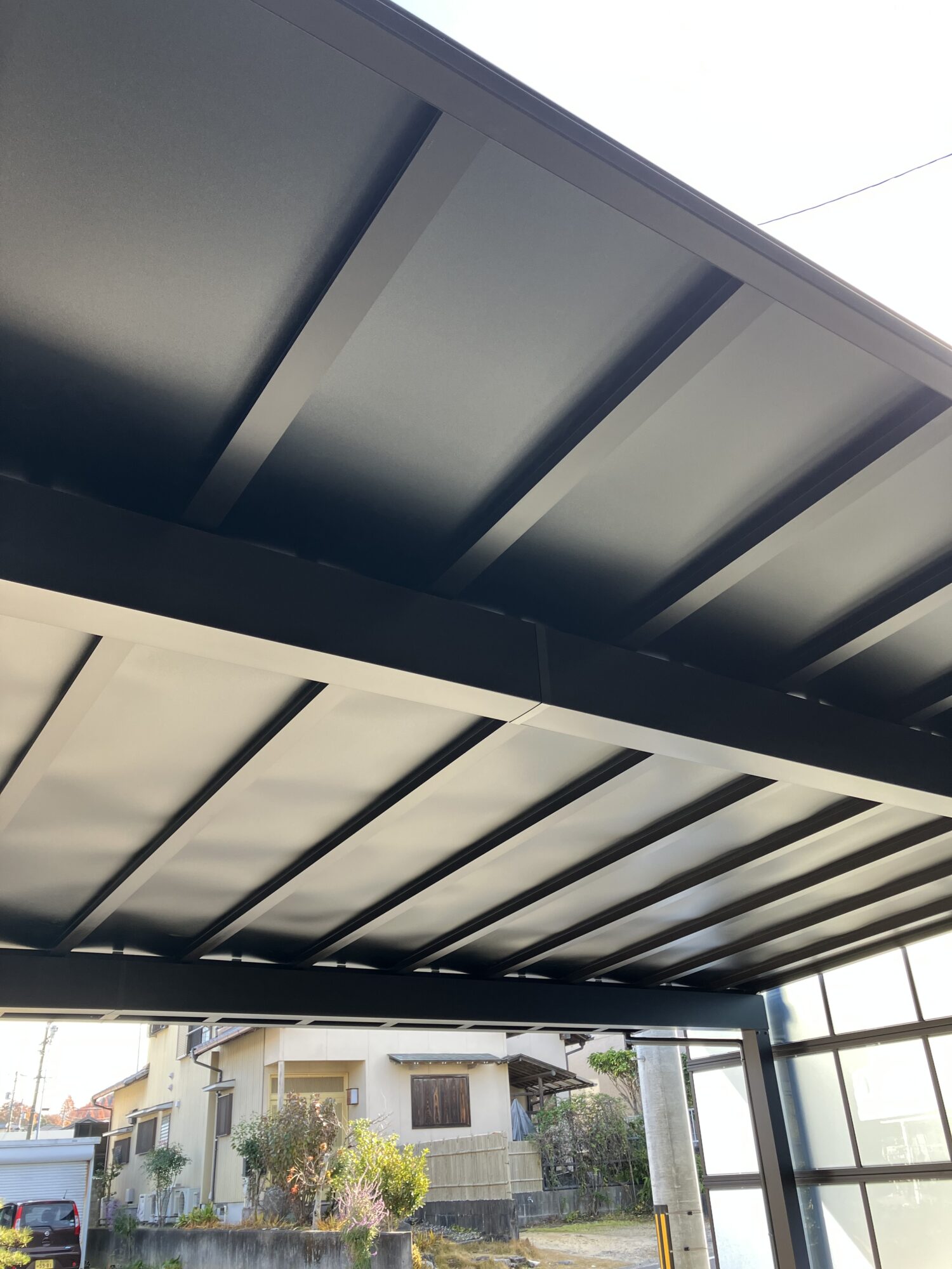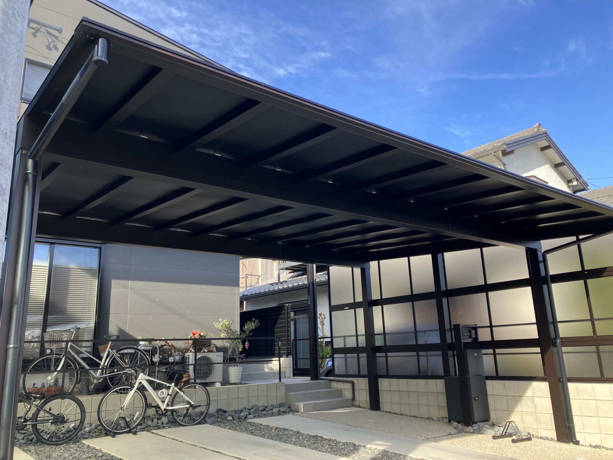 新居への入居に伴いカーポートと玄関前のテラス工事をさせていただきました。カーポートの屋根パネルには最近じわじわと人気のブラックマット色の屋根パネルをお選びいただき、ブラック色の本体色と相まって異彩を放つ漆黒のカーポートとなりました。ブラックマット色のポリカーボネート屋根は、明るさ可視光線透過率と紫外線透過率はともに0%。熱線カット率は72%と見た目だけではなく機能性も備えています。カーポートの大きさも敷地を有効にお使いいただけるように間口はカット加工して敷地に合わせています。側面パネルは隣地からの視線を遮りながらも光を取り込めるトーメイマット色を選んでいます。玄関前のテラス屋根の屋根パネルには夏の暑さを和らげながらも光を取り込める熱線遮断タイプの屋根パネルを選びました。